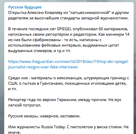 Вот это, собственно, и есть те самые «стандарты западной журналистики». Они не величайшие, они постоянно дают сбои, правда далеко не всегда торжествует, но они есть. Попробуйте себе представить такую ситуацию по итогам любой статьи Лапшеснималочной (например) в каком-нибудь российском СМИ. И эти стандарты вырабатывались многие десятки лет в результате череды скандалов, постыднейших провалов, даже трагедий из-за журналистской безответственности или лени. А нам необязательно их все повторять! Мы можем просто взять и пользоваться! Но я не то чтобы полон оптимизма по этому поводу, потому что у нас самых патологических, самодовольных лжецов вовсе не наказывают, а награждают эфирами в прайм-тайм, даже простое извинение сквозь зубы считается чем-то из ряда вон выходящим. Стандартам неоткуда взяться, если никакими последствиями их нарушение не грозит.