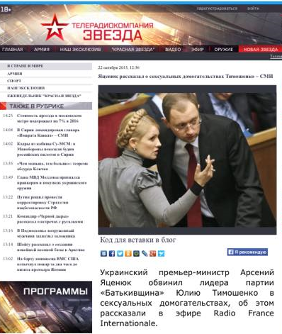 Как видите, схема одна и та же: какая-то скандалезная фальшивка с сексуальным оттенком про украинское руководство со ссылкой на известное СМИ. Сайт medialeaks.ru проследил путь фейка про Тимошенко и Яценюка с oppps.ru до сайта телеканала “Звезда”:
