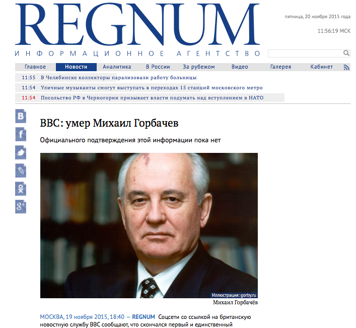 Это тоже фальшивка с oppps.ru. Несмотря на то, что это полный, очевидный фейк, BBC ничего подобного не сообщала, о чём глава русской службы BBC написал в фейсбуке у главреда “Регнума”. Лапшеснималочная обратилась к Модесту Колерову, главреду “Регнума” с просьбой удалить этот и другой фейк, появившийся на сайте агентства в тот же день — Колеров отказался, мотивировав это тем, что “ангажемент опровергателей мне ясен”. Не буду, то есть, удалять фейк, потому что Лапшеснималочная мне не нравится. Фейковая статья про смерть Горбачёва висит на Регнуме до сих пор, месяц спустя.