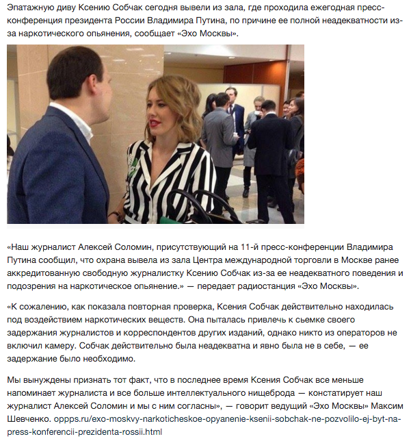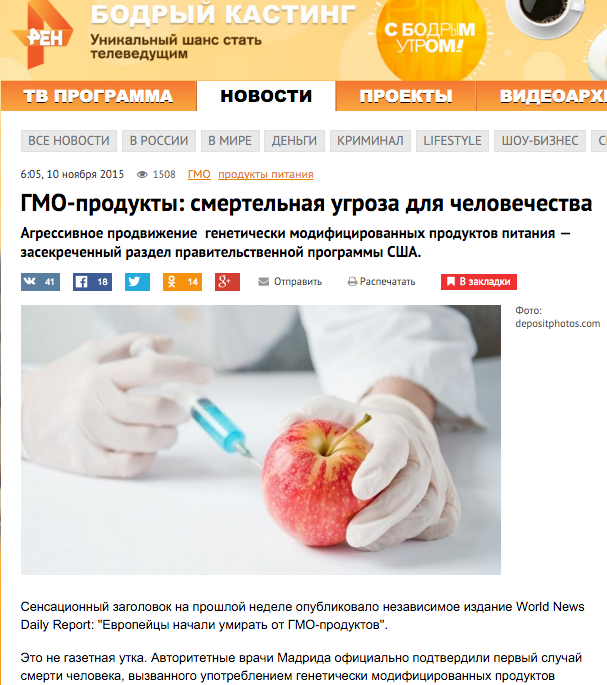 А бывает и так, что очередной фейк с таких сайтов окольными путями попадает в эфир и на сайты федеральных телеканалов. Самый известный пример: