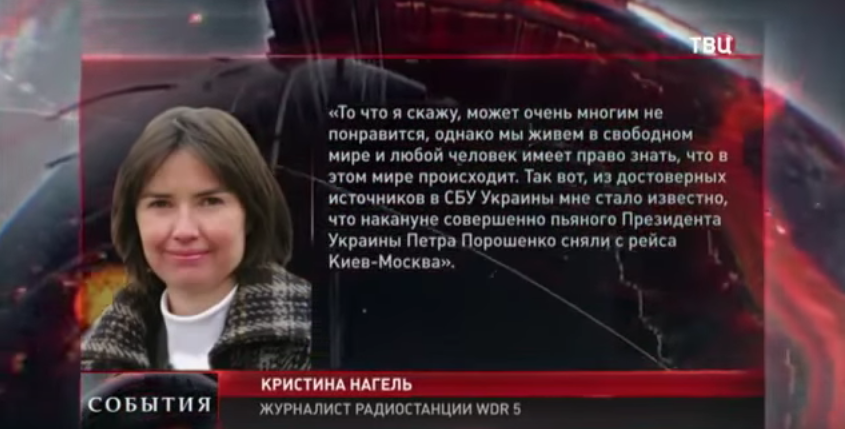 Другие телеканалы не дожидаются подсказок от анонимных интернет-помоек и выдумывают новости — не просто выдумывают, а делают это от лица известных западных журналистов и СМИ — самостоятельно. Телеканал ТВЦ, например, запустил фейк про “Пьяного Порошенко сняли с рейса”, приписав его немецкой журналистке: