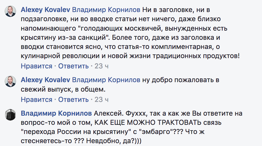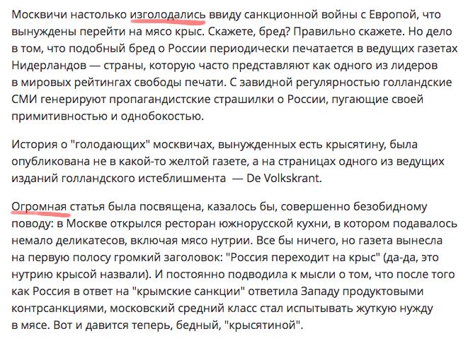 Началось всё с того, что на сайте РИА Новости вышла заметка Владимира Корнилова под заголовком “Москвичи едят крыс: кто сочиняет фальшивые новости про Россию”: