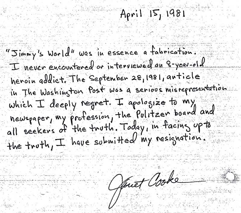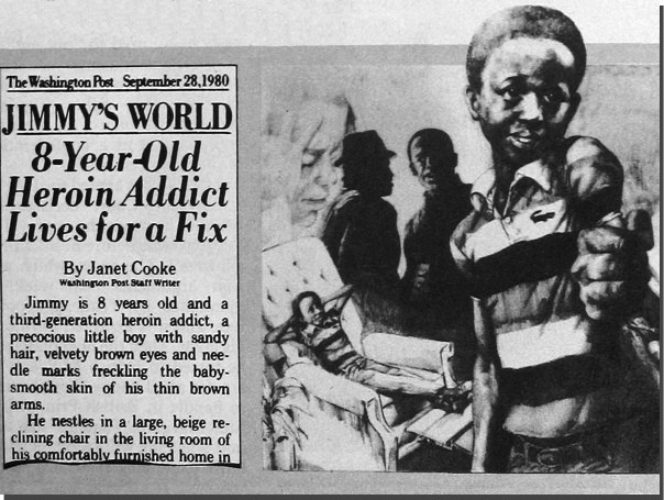 Есть только одна проблема: никакого Джимми не существовало. Автор статьи, Джанет Кук, полностью выдумала и его, и родителей, и все подробности статьи, кроме комментариев настоящих экспертов, которых она тоже одурачила вместе со всеми своими редакторами и миллионами читателей. Кук погорела на том, что наврала не только в самой статье, но и в своей автобиографии номинанта на Пулицеровскую премию: приписала себе диплом престижного университета, который не заканчивала, знание языков, на которых на самом деле не говорила, и так далее. Её бывшие работодатели сообщили в редакцию «Вашингтон пост», что она, мягко говоря, присочиняет насчёт своих заслуг. Среди коллег Кук были сомневающиеся в её истории про Джимми, но им так и не удалось преодолеть сопротивление руководства — самых заслуженных и уважаемых в США журналистов и редакторов. Одним из них был Боб Вудворд, прославившийся расследованием Уотергейтского скандала.